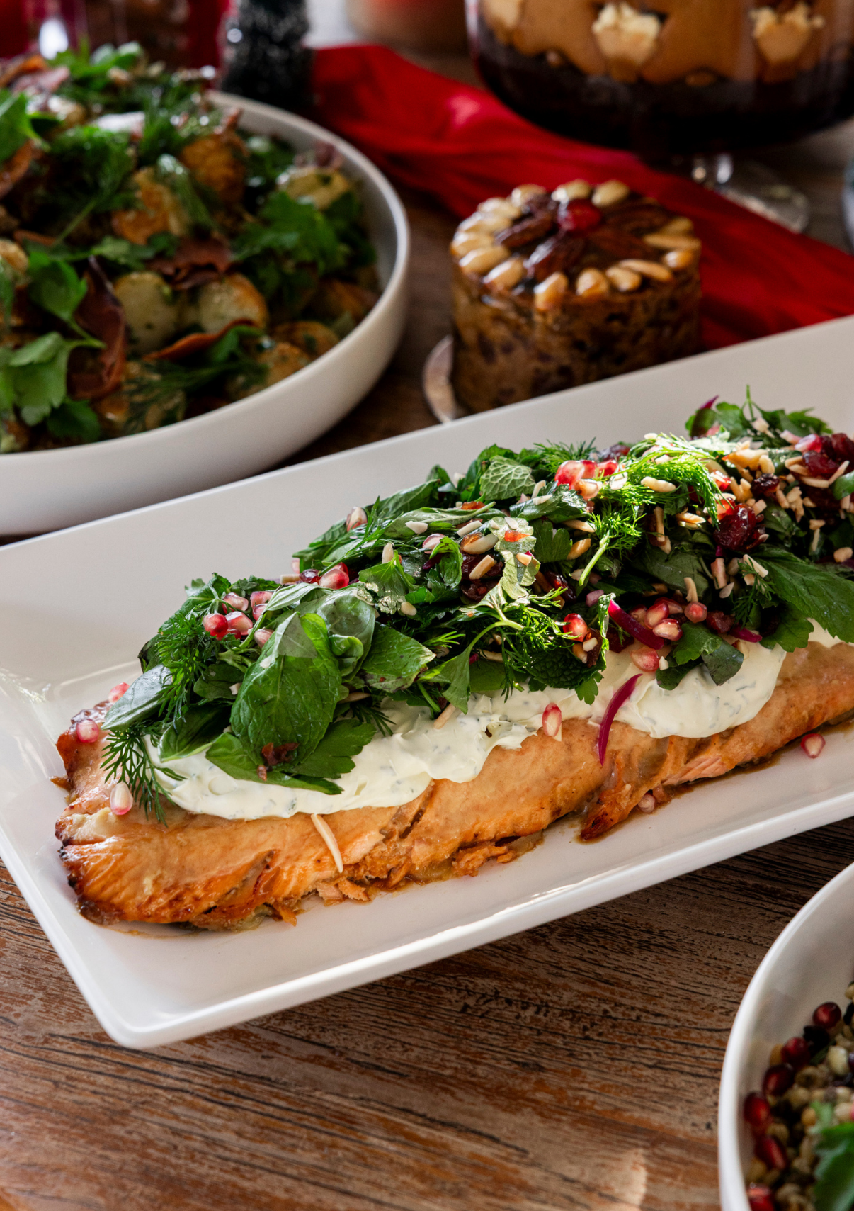 Honey-glazed baked salmon with dill crème fraîche, almonds, pomegranate and herb salsa. Serves 8–10, 110g per serve.