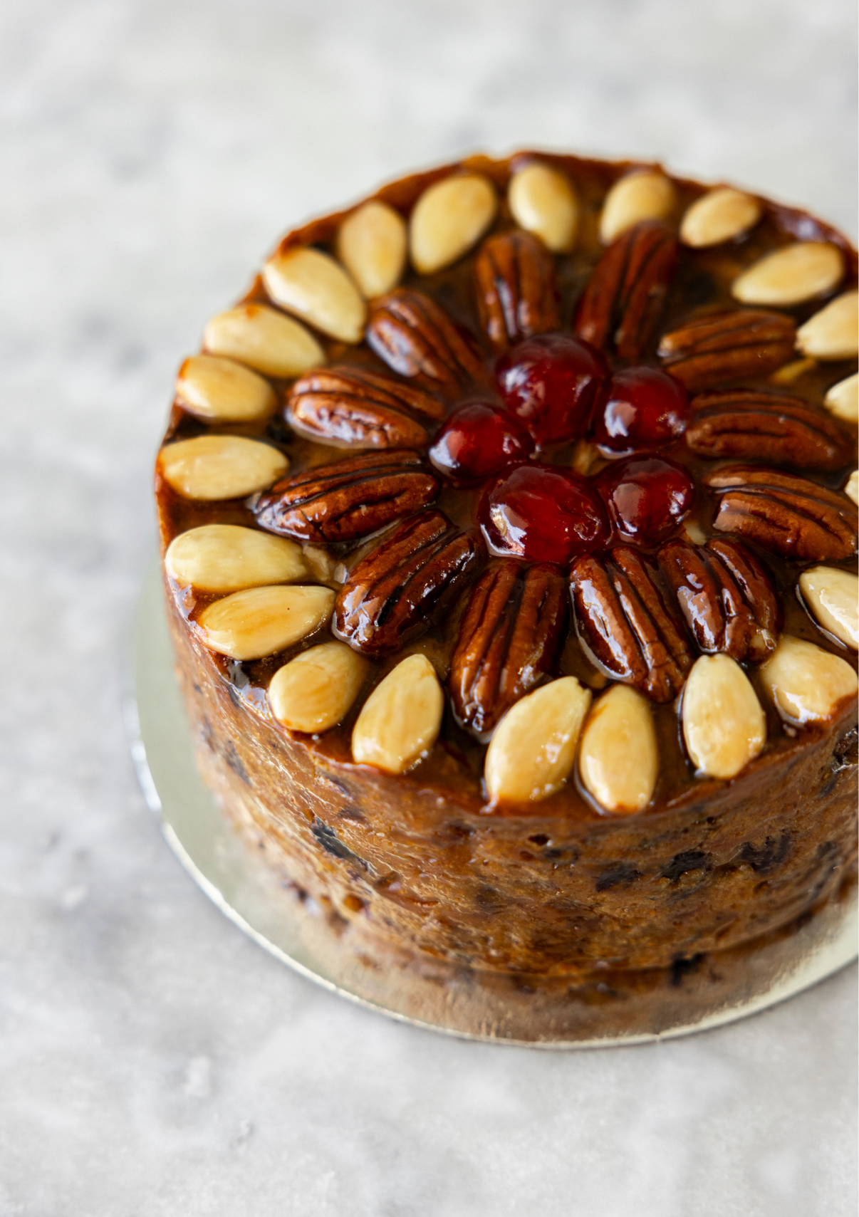 Rich Christmas Cake mixed with fruits and nuts soaked in sherry syrup. Perfect for gifting or sharing. Available in 500g and 1kg.
