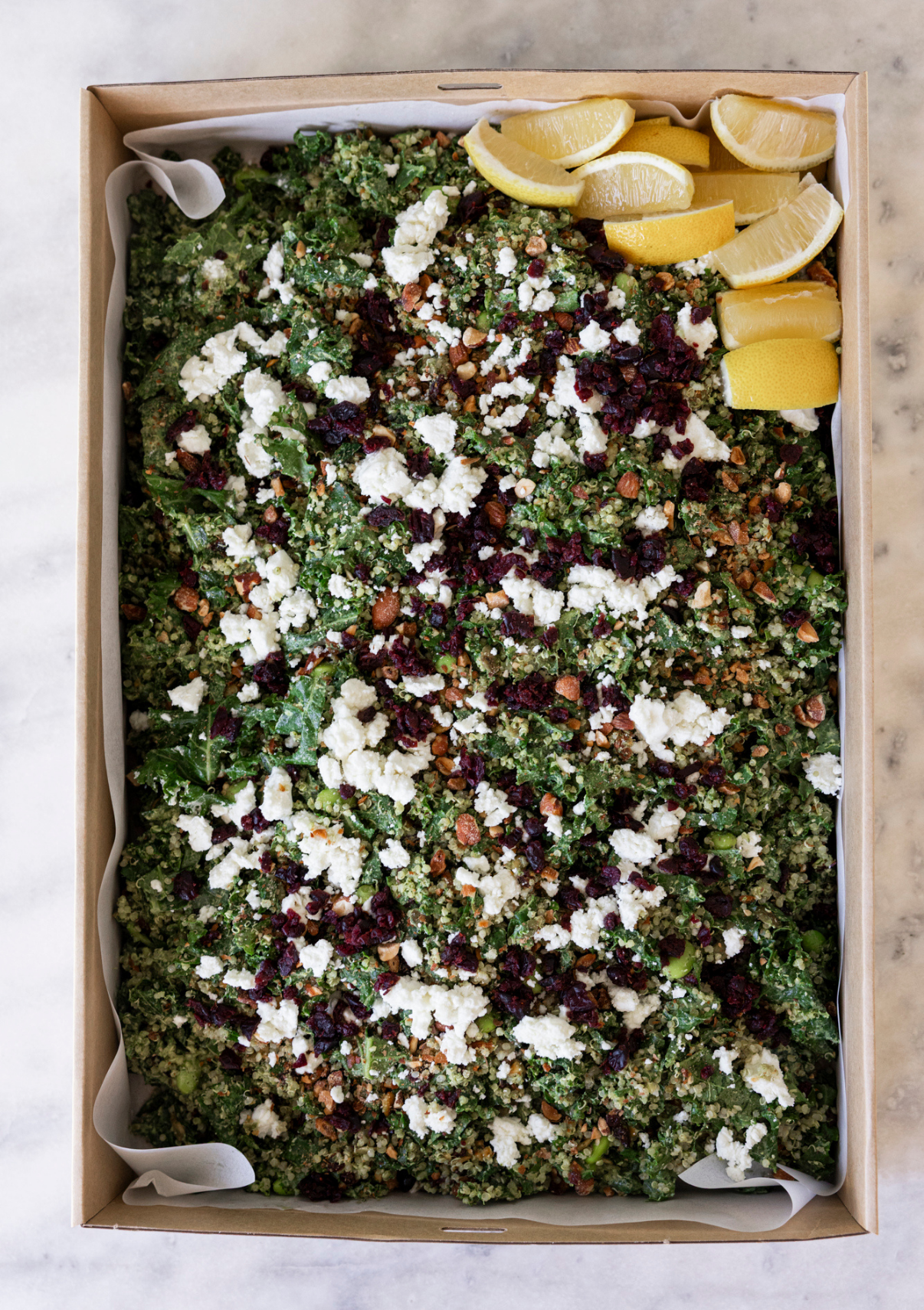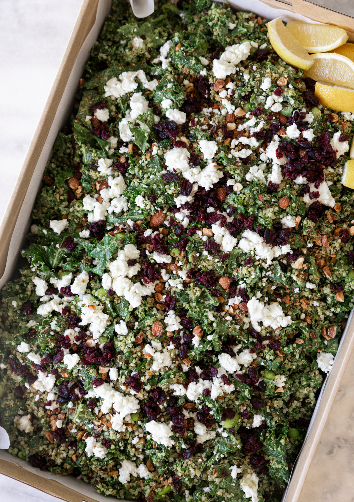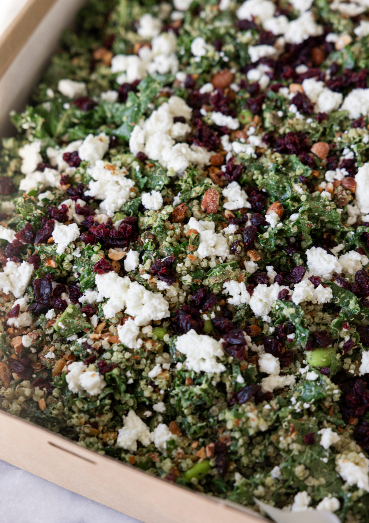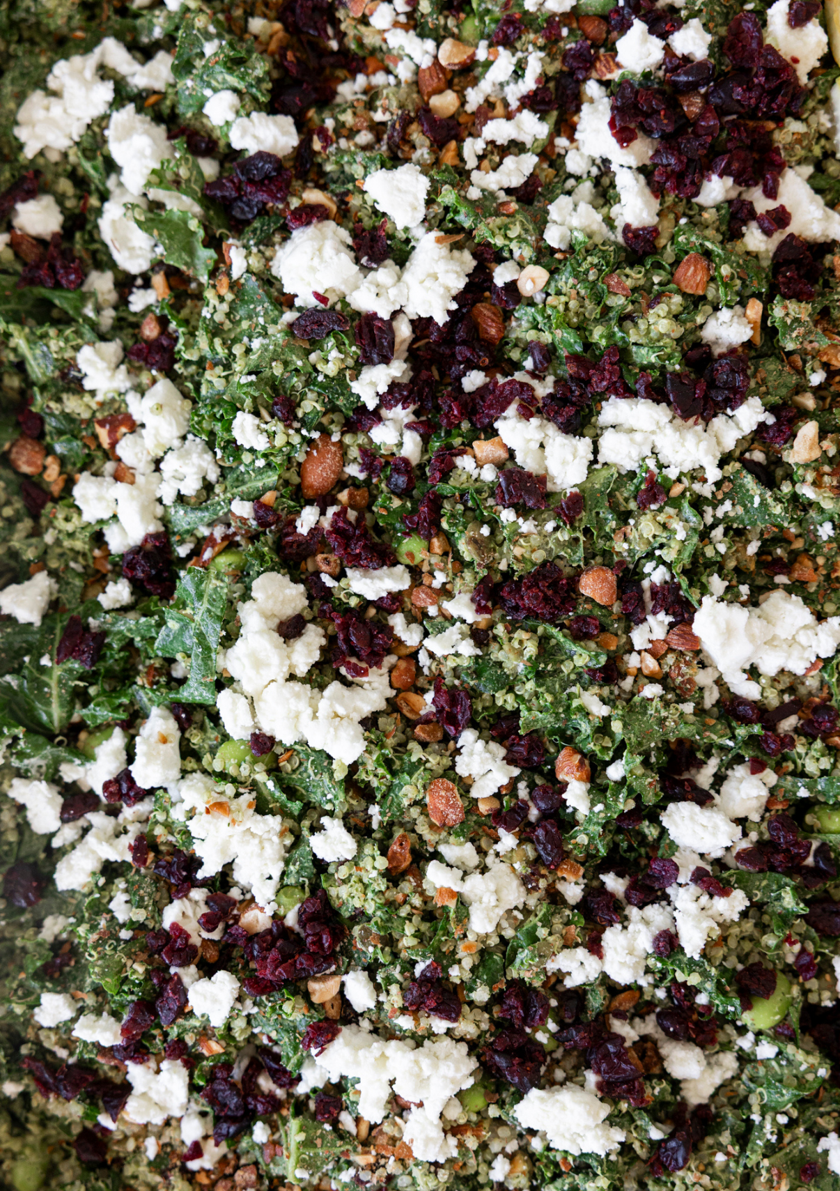 Green salad, kale, edamame, quinoa, cranberries, almonds, goat's feta, green goddess dressing